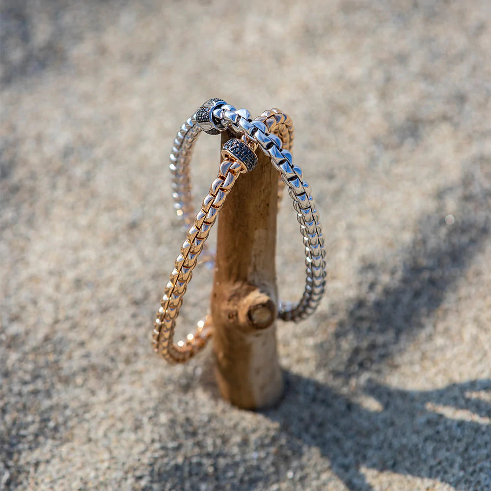 Warum soll moderner Goldschmuck nur den Frauen vorbehalten sein? Das dachten sich wohl auch die Goldschmiede und Designer von Fope und schufen kurzerhand Kreationen für den Herrn. Dabei werden die berühmten Goldgeflechte mitsamt der Flex’it-Technologie mit neuem Steinbesatz kombiniert, der überwiegend aus edlen schwarzen Diamanten besteht. Hiermit hat Fope neuen Schmuck geschaffen für Männer, die das Besondere schätzen und auf ein stilbewusstes Auftreten Wert legen.