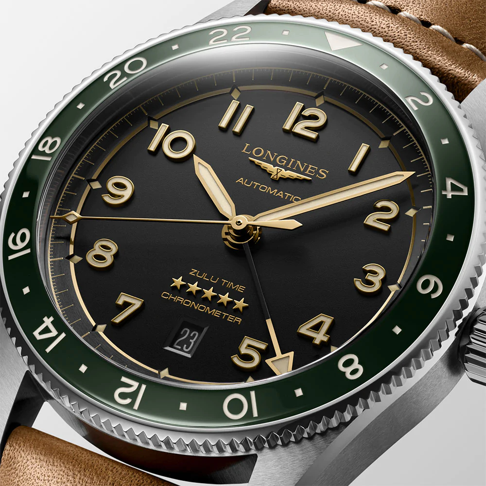 Edelstahlgehäuse und Zifferblatt liefern mit 42 Millimetern Durchmesser, klaren arabischen Ziffern und robusten Zeigern bestes Fliegeruhren-Design. Die Longines Spirit Zulu Time ist in verschiedenen Ausführungen mit schwarzem, blauem oder grünem Zifferblatt erhältlich. Dezentes Detail ist der GMT-Zeiger, der sich je nach Zifferblattfarbe in Blau, Orange oder Gold abhebt. Durch die Beschichtung mit Super-LumiNova lässt sich die Uhrzeit auch bei schwierigen Lichtverhältnissen perfekt ablesen.