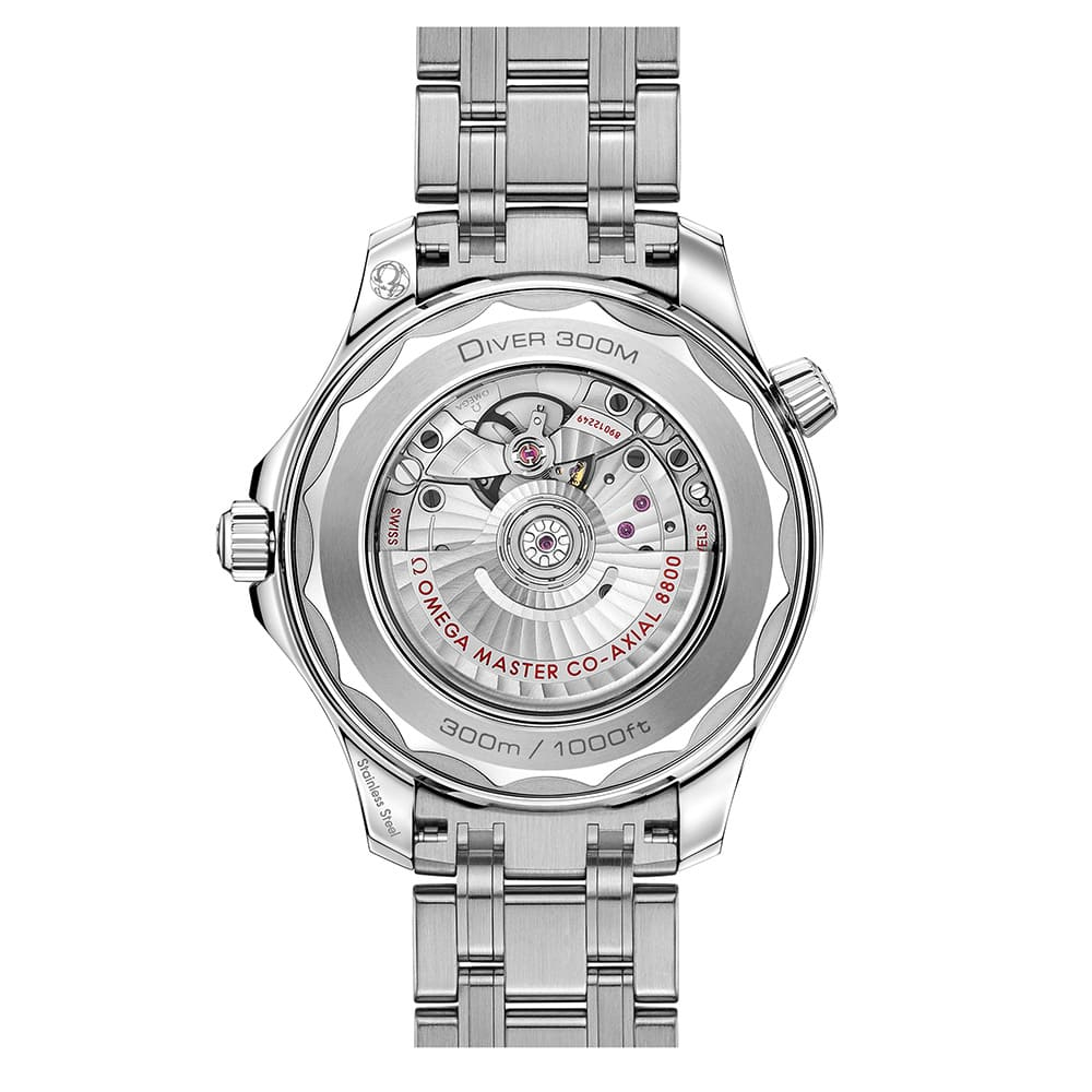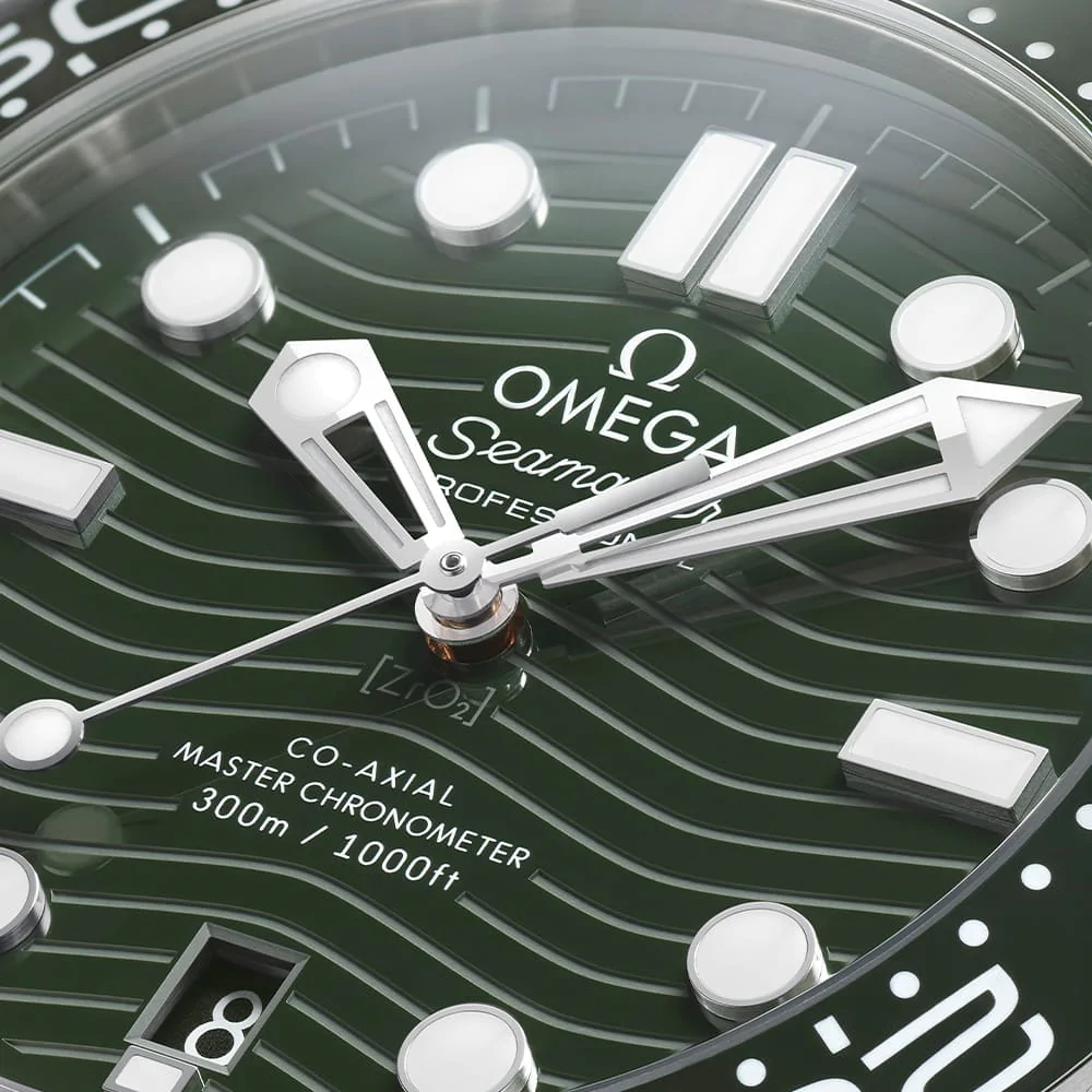 Die Taucheruhr verfügt über ein Edelstahlgehäuse von 42 Millimetern Durchmesser und ist bis 300 Meter wasserdicht. Sie fesselt mit ihrem Zifferblatt aus polierter Keramik, dem lasergravierte Wellen Dynamik verleihen. Das Datumsfenster ist bei 6 Uhr positioniert und fügt sich harmonisch ins Design ein. Zeiger und Indizes sind mit weißer Super-LumiNova gefüllt und somit auch bei schwierigen Lichtverhältnissen – zum Beispiel unter Wasser – sehr gut ablesbar. Ergänzend dazu ist auch die Tauchskala der Keramiklünette aus weißer Emaille gefertigt. Das Master Chronometer Kaliber 8800 kann durch den Sichtboden aus Saphirglas bei seiner Arbeit betrachtet werden. Die Taucheruhr wird am grünen Kautschukarmband getragen.