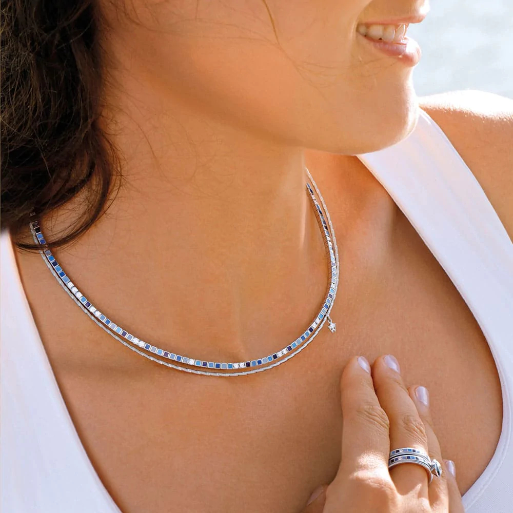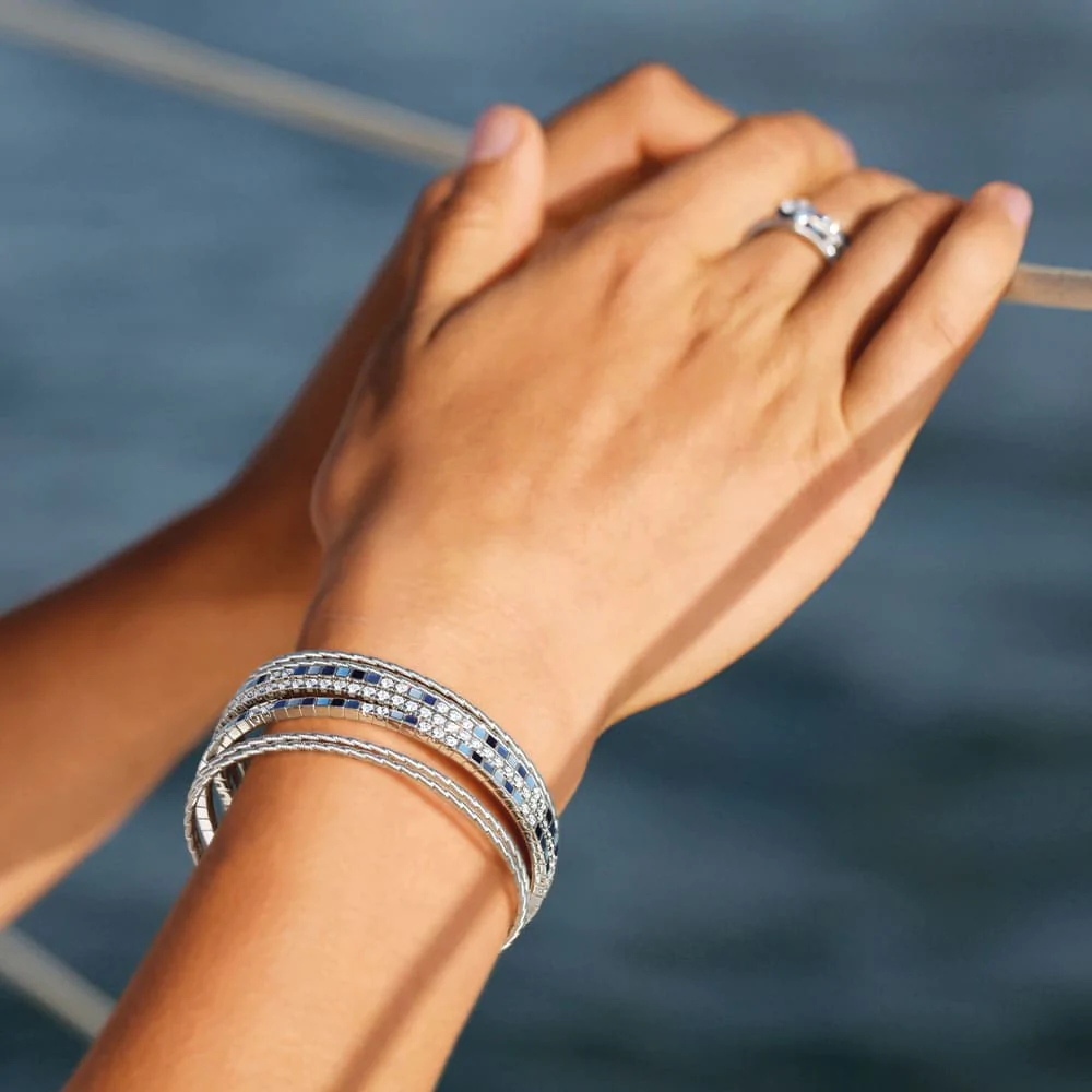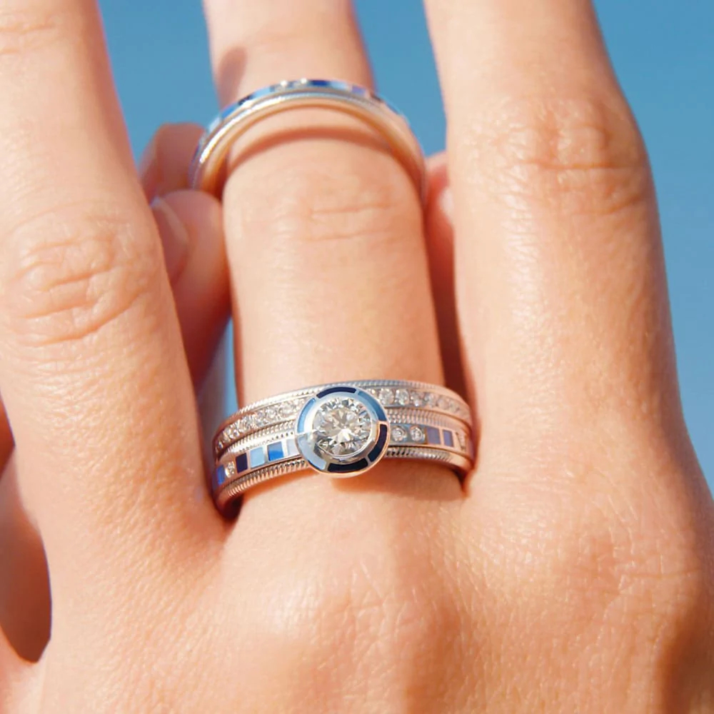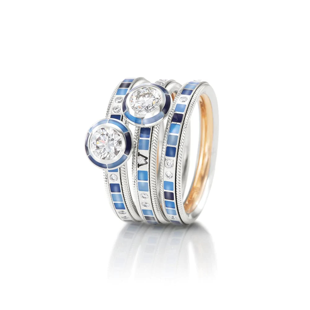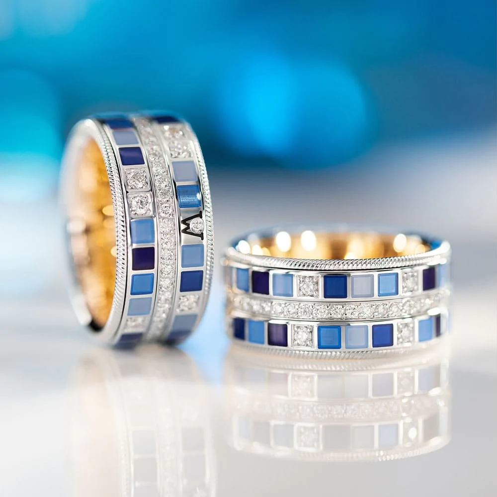 Der Ring mit einer Breite von 10 Millimetern transportiert die Botschaft mit einem Farbspektrum von Wellendorff-Kaltemaille in Blau bis Schwarz. Er ist aus 18-karätigem Weißgold gefertigt und die Brillanten fügen sich optisch perfekt in den Rhythmus der farbigen Quadrate ein. Eine zusätzliche Brillantreihe im Zentrum des Rings funkelt wie die Wasseroberfläche des Ozeans in der Sonne. Nicht umsonst bezeichnen Wellendorff-Connaisseurs ihn als den „lebendigsten Ring“ der Welt: Mit jedem Dreh der drei Innenringe verwandelt er sich in tosende Wellen des Meeres ‒ dynamisch, wild und frei. Die funkelnden Brillanten fließen um den Finger der Trägerin, und die kleinen Mosaike in fünf Blautönen erinnern daran, dass auf jeden Sturm auf hoher See auch wieder ein sonniger Tag folgt, an dem das Wasser friedlich in hellblauen Nuancen glitzert.